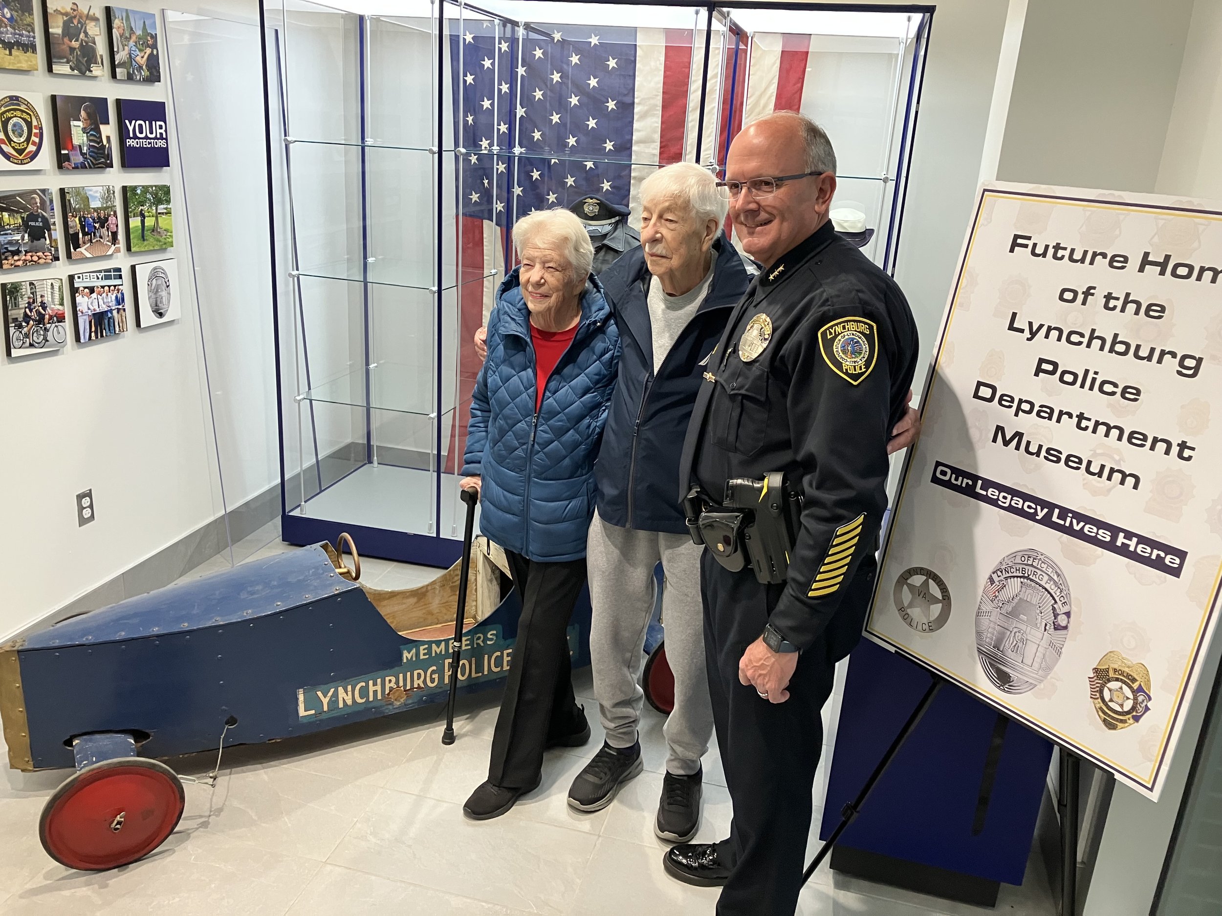 Martha and Claude Tuggle, along with Interim Police Chief Ken Edwards, stand next to the 1951 LPD Soap Box Derby Car.